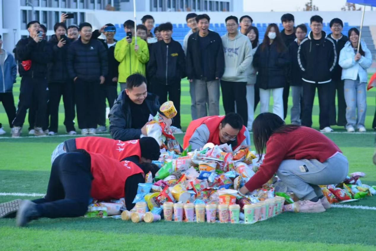 本次运动会设置摸石过河、南水北调、开心消消乐、极速三子棋、零食大作战五大特色项目。在摸石过河环节,智能采矿工程专业辅导员何孟潮老师身手矫健,带领学生团队以默契配合完成20米泡沫板接力,引发现场惊呼;南水北调项目中,矿物加工工程专业班主任曹恩豪老师与师生组合接力传递20升水,最终保住超10升水量,展现精准协作能力;开心消消乐通过师生策略配合翻牌寻对,现场欢笑与懊恼声交织,凸显记忆与统筹的双重挑战;极速三子棋则由冶金工程专业师生配合完成绝杀棋局,展现智慧与速度的完美结合;零食大作战环节,班主任化身“零食战士”拼手速抢零食,操场秒变“甜蜜战场”,师生默契配合“吃”出友谊、“战”出精彩。